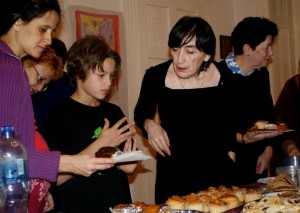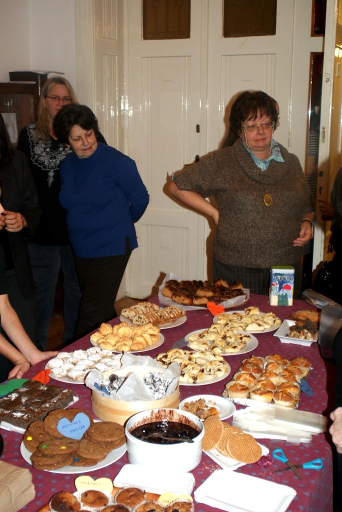 Rákosi Éva szakértő szervezése és részvétele mellett tizenegy további mestercukrász készítette el azokat a különleges süteményeket, amiket november 5-én és 6-án megkóstolhattunk. (Aki esetleg nem – annak türelemmel kell várnia egy másik hasonló alkalomig, vagy kitalálnia egyet!). Volt olyan sütemény – Csonka Katalin és Dr. Fejér László műve – amely ráadásul kalandos úton, a zalakarosi távolsági busz sofőrjére bízva érkezett meg Budapestre, majd Rákosi Éva jóvoltából a buszpályaudvarról a Rádayba. Ezek az édességek: a csokivarázs, a fügetorta, a gyümölcskenyér, a különféle muffinok, a „Pöttyös”, a biopapucs, a kókuszcsók, a pudingos … és el se lehet mondani, még milyenek, most nemcsak a vendégek élvezetéért készültek. Elsősorban azért, hogy a Szim Salom közössége hozzájáruljon a Hospice Ház betegszobai ablakainak cseréjéhez.