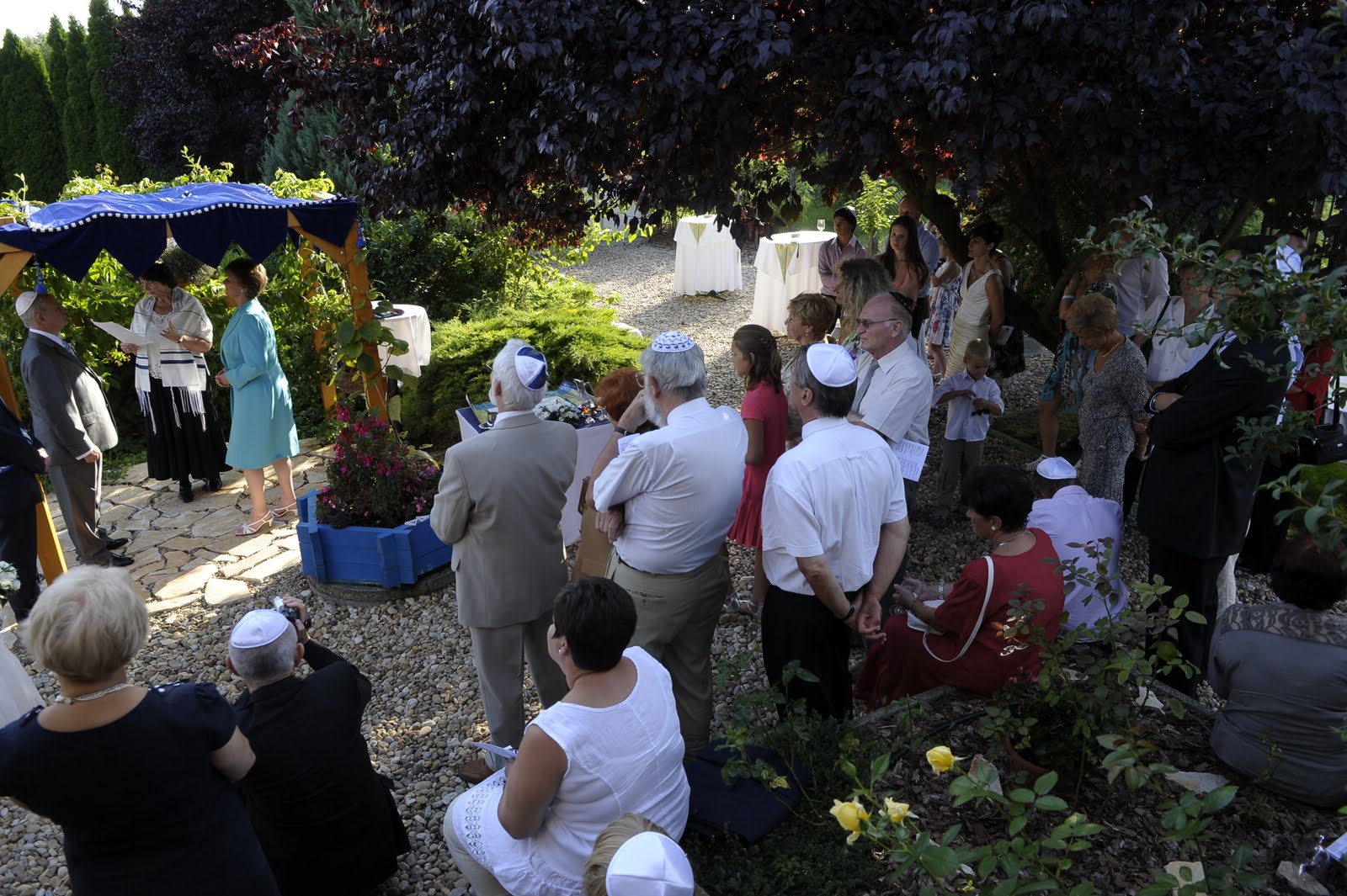 A fák, a virágok, a tóparton álló pergola, a tóban a ragadozómadár támadást túlélt és utánpótlásul az utolsó pillanatban beszerzett aranyhalak, a pampafű, még a szomszédban békésen legelésző kecskék is mosolyogtak azon a szép nyári napon, mikor Erika és Tamás igent mondott egymásra, az életre és családjaikra – egymásnak és minden jelenlévőnek. Gyerek és felnőtt, barát és rokon, magyarul, angolul, szavakkal és öleléssel köszöntötte Őket, akik Szentkirályon (HaMelech HaKados) új család lettek azon a vasárnapon, augusztus 14-én. A család és a közösség ünnepe volt, ajándékot nem kértek, hanem inkább adtak, adományt, szeretetet, odafigyelést maguknak, barátaiknak, a Szim Salomnak. Kívánunk nekik hosszú, boldog közös életet! Mázál tov!